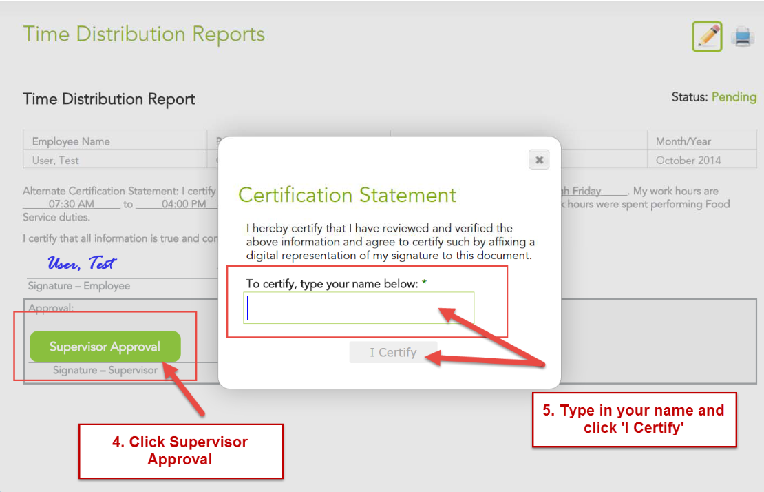 4. Click the Supervisor Approval button. Type your name (first & last name) in the box. Select I certify.