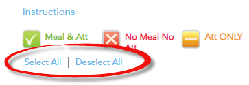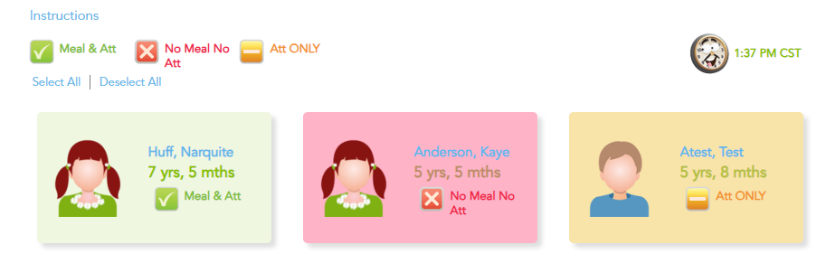 Click a child’s name once to turn them red (not present for meals or attendance). Click twice to turn them yellow (present for attendance only, not meals).