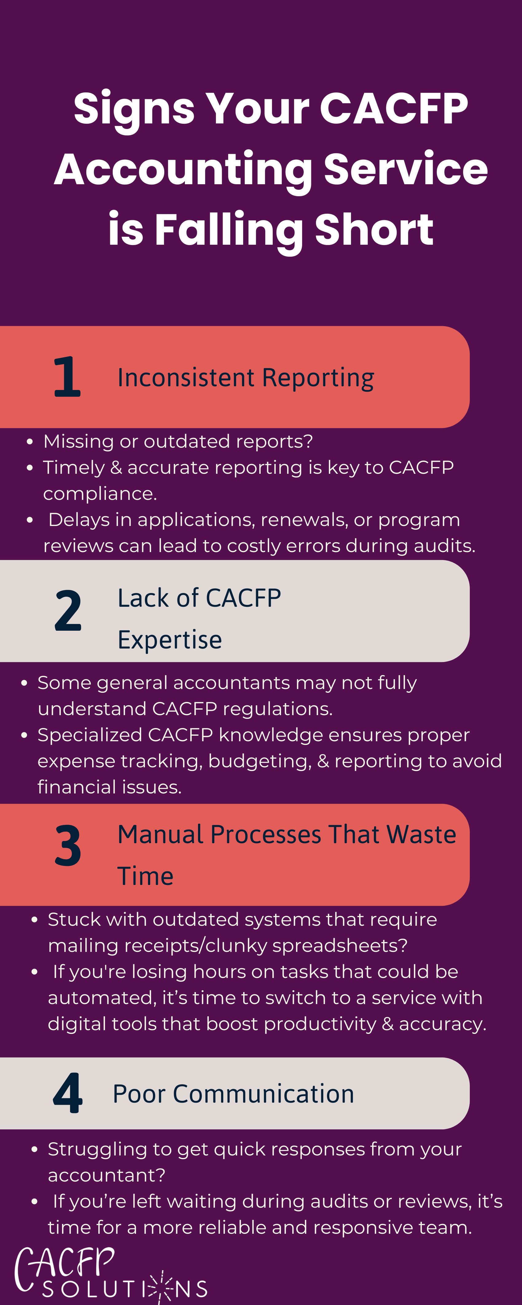 1. Inconsistent Reporting Are you struggling with missing or outdated financial reports? Timely and accurate reporting is essential for CACFP compliance, yet many services fall short.