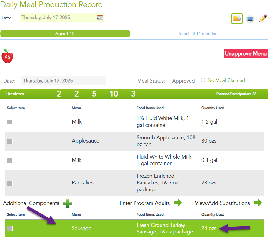 • Everything in one place: All of your additional food items will still display on your meal production records as usual, but now with the correct calculated amounts.